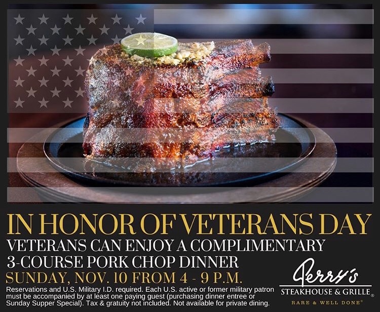 In honor of Veterans Day, we are pleased to offer a complimentary 3-course pork chop dinner to U.S. active military and veterans on this Sunday, Nov. 10 from 4-9 p.m. The dinner features a choice of soup or salad, followed by the legendary, seven-fingers-high, slow-roasted, caramelized pork chop and the decadent dessert trio. Each veteran must be accompanied by at least one guest who purchases an entree or Sunday Supper Special. Reservations and a Military I.D. are required to receive this special offer - make your reservations today!