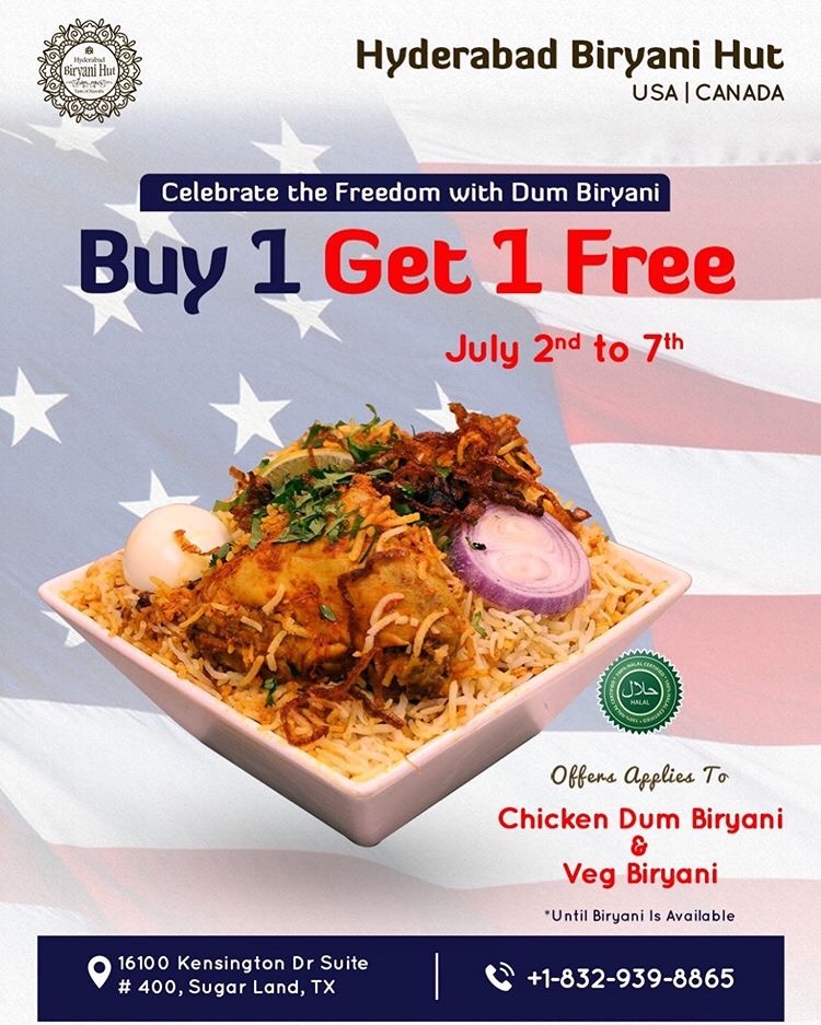 Celebrate the Freedom with Buy One Get One Free Biryani from July 2nd to July 7th at Hyderabad Biryani Hut in Sugar Land. I wanted to share this great offer to my forum friends that like Biryani.