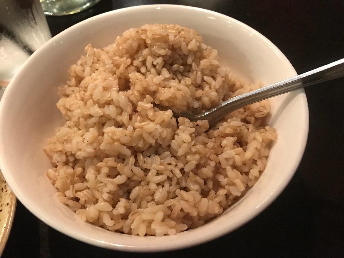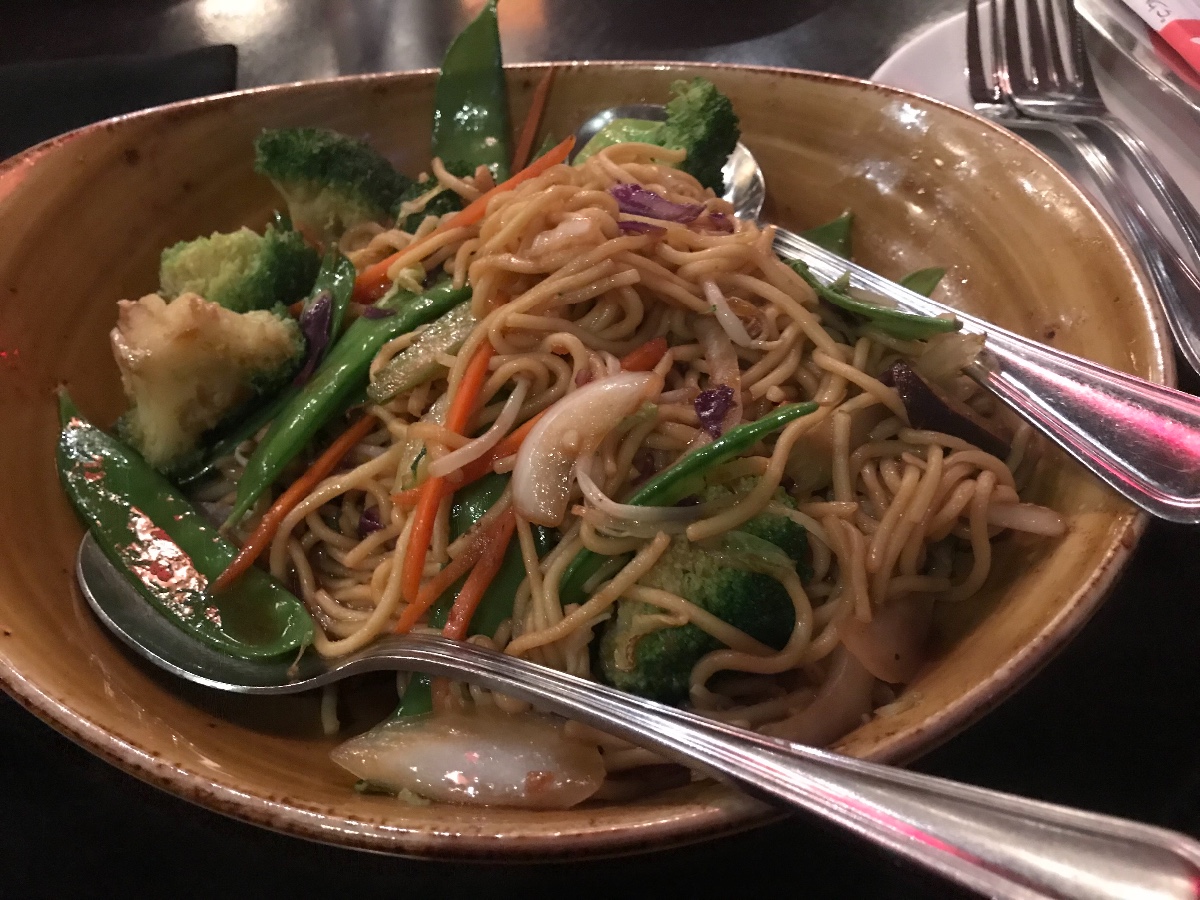 Eating at PF Chang's. As always, it was delicious. We had stir fried Spicy Eggplant and Signature vegetable Lo Mein with brown rice.