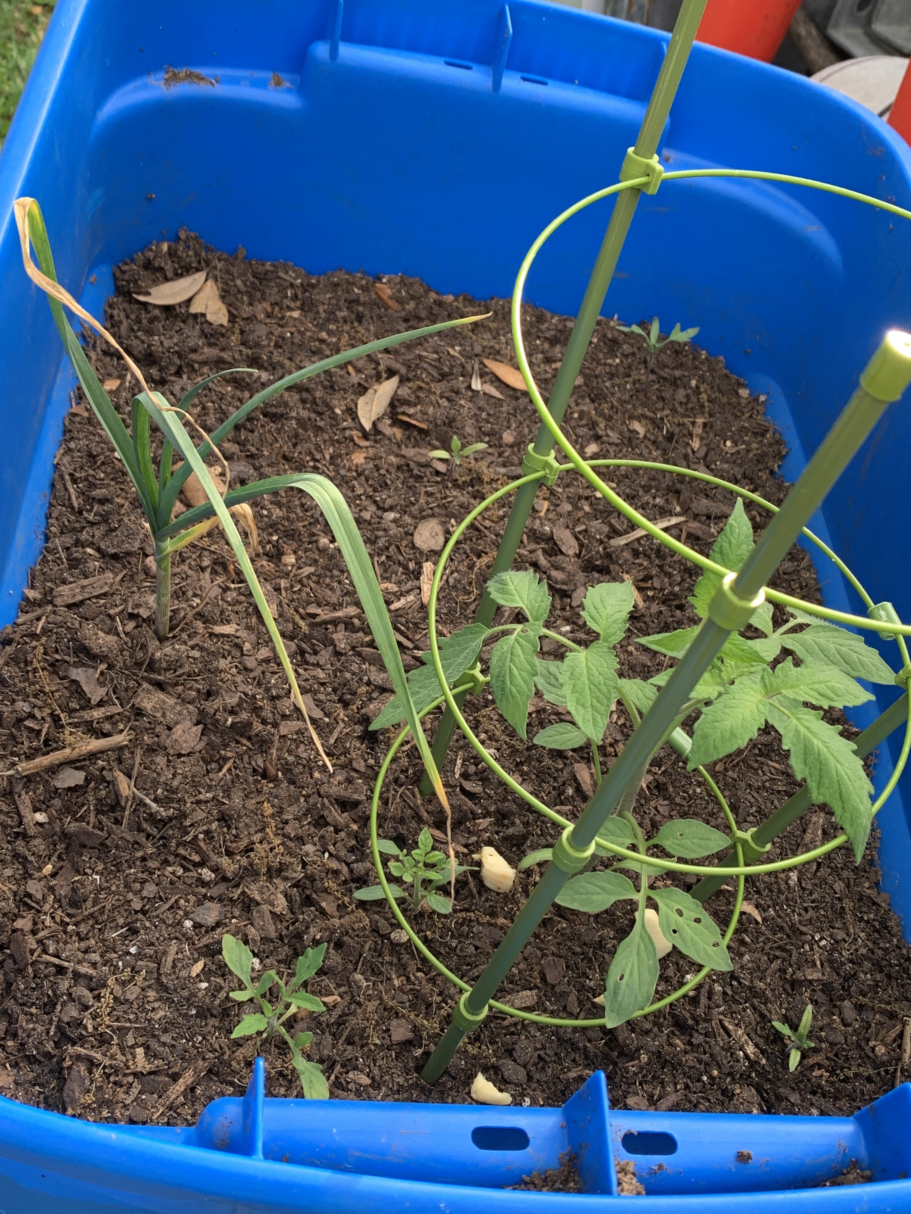 I've been growing a small garden for several months now and I'm so proud of its progress! I recently repotted some tomato plants into a plastic bin that I repurposed, with a garlic plant and garlic cloves that will hopefully sprout. It's only been a few days since repotting but things still look good! I'm hoping the garlic plants will help deter pests from the tomato plants as they all grow together. I'm pretty new to gardening so any tips, tricks, or advice is greatly appreciated.
