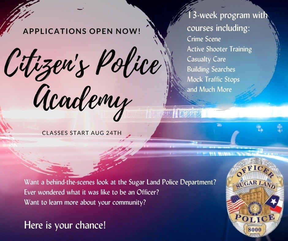 The Citizen's Police Academy is an opportunity to take an inside look at the Sugar Land Police Department, a remarkable organization of people and technology. This class is offered free of charge.