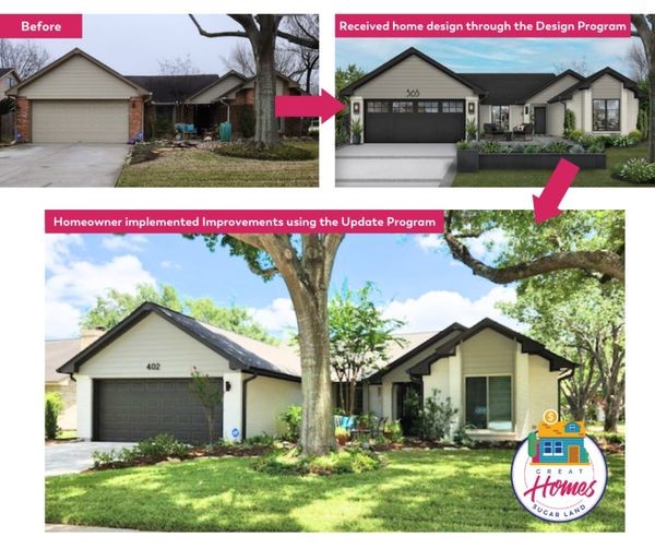 The Great Homes Design Program offers Sugar Land homeowners and homeowner associations (HOAs) an innovative exterior home design at an exclusive local rate. Plus, homeowners can receive up to a $500 rebate for making significant qualifying exterior improvements within six months of receiving their design.