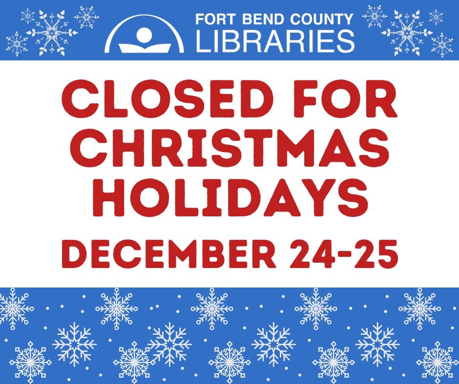 Fort Bend County Libraries will be closed Tuesday and Wednesday, December 24 and 25, for the Christmas holidays. Normal library hours will resume Thursday, December 26.