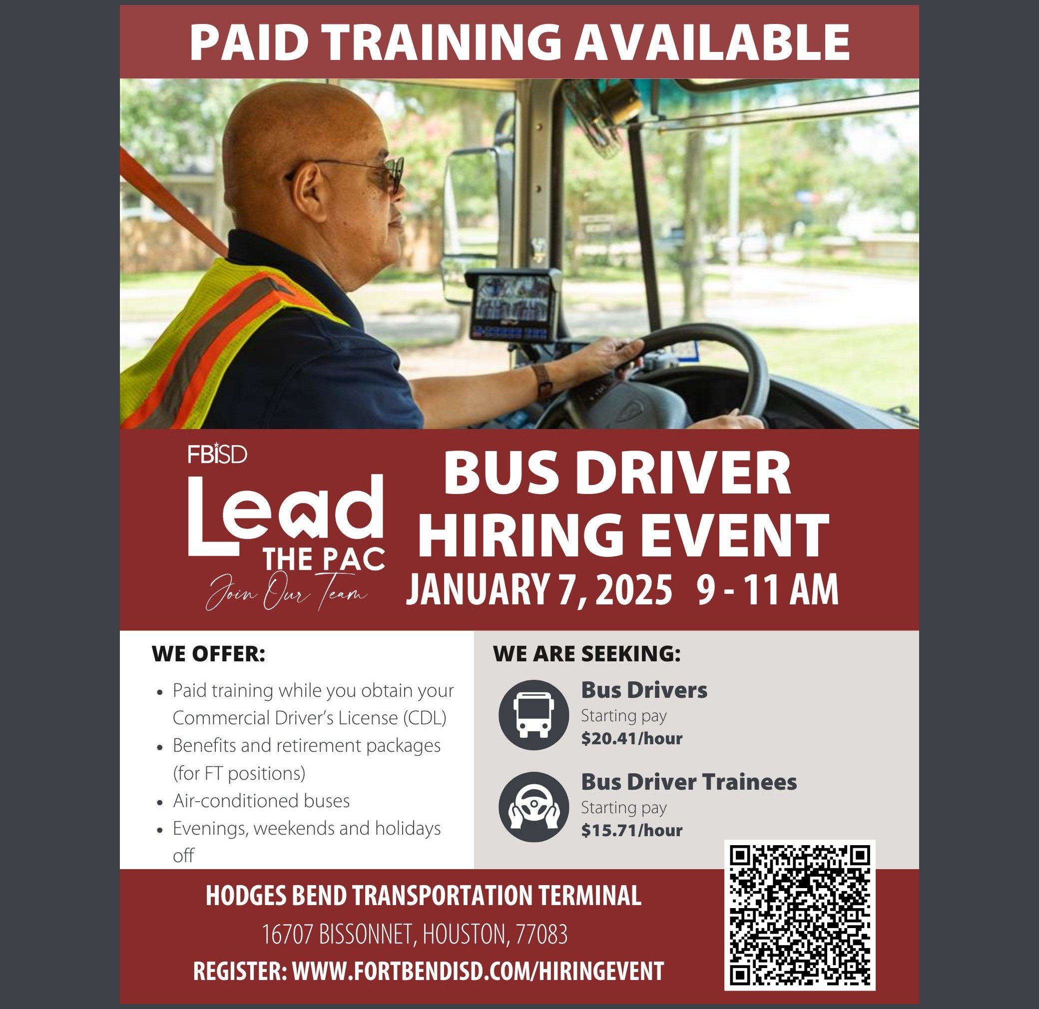 REMINDER: Registration is open for Fort Bend ISD’s January 7 Bus Driver Hiring Event!