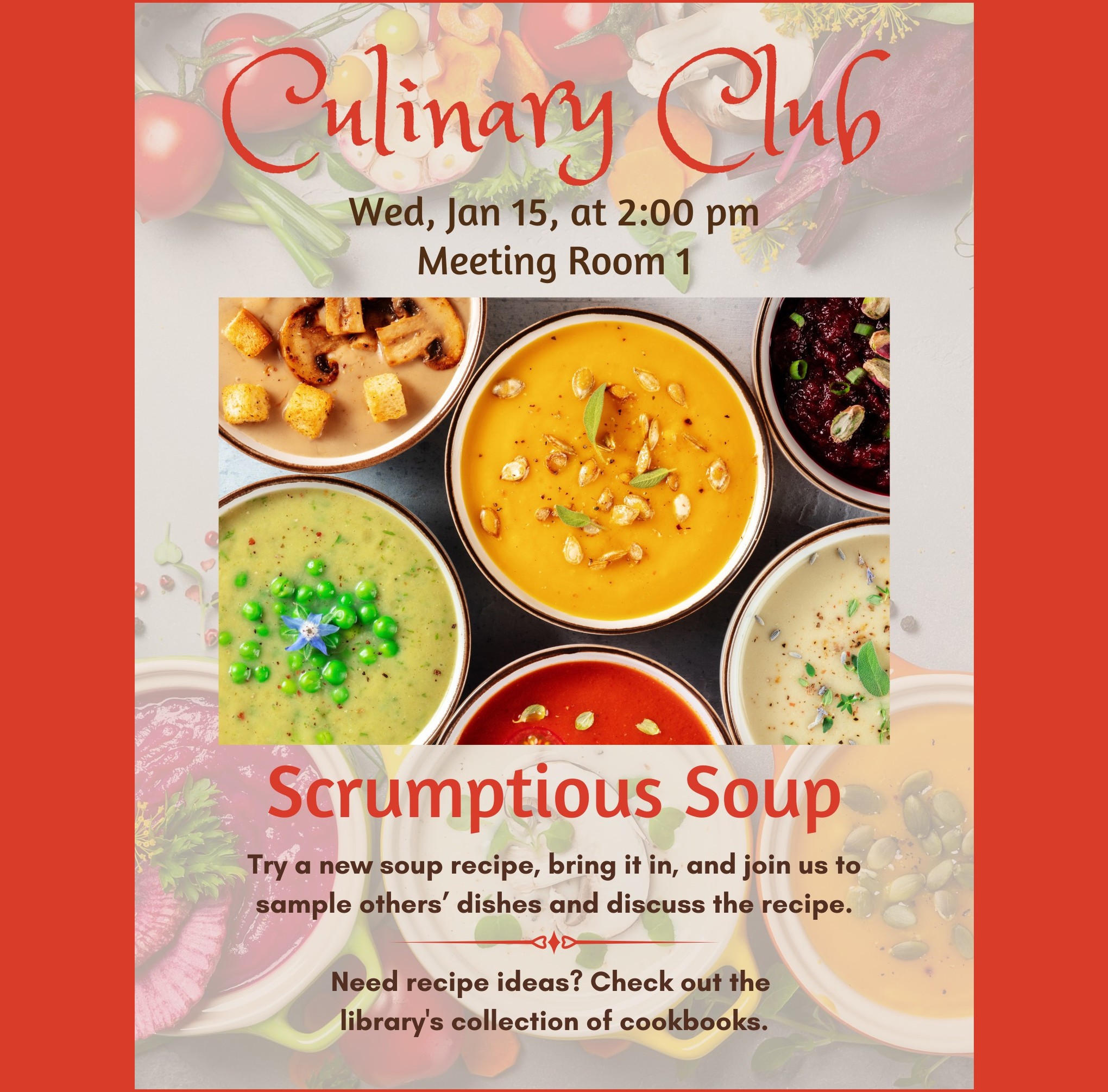 Culinary Club is a monthly recipe exchange. Join them as they discuss their recipes and share our experiences in the kitchen! Cook up something new that fits this month’s theme – Scrumptious Soups.