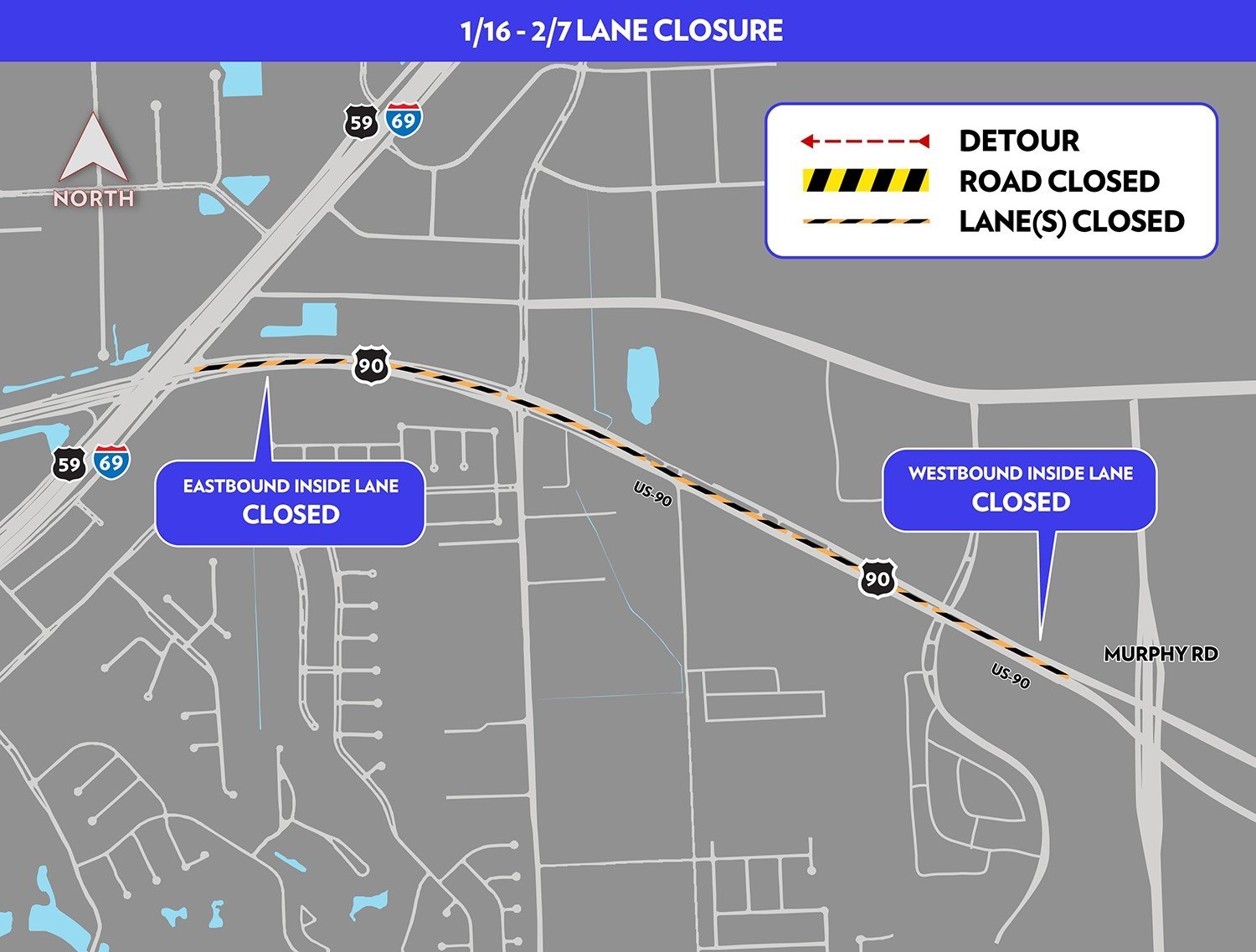 Lane closures will remain in effect until 2/7 at 4 p.m. US-90 will remain open to through traffic on the outside lanes.