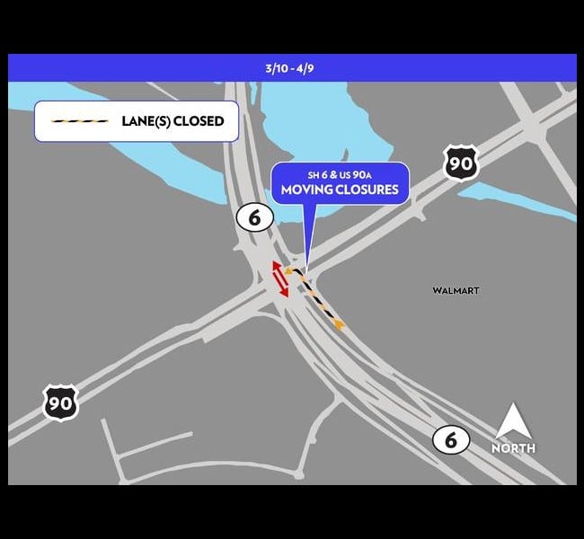Left turn lanes will be added in-place of a straight through lane on SH 6 at the intersection of US 90A. This mobile operation (moving lane closure) will utilize flaggers to direct traffic.