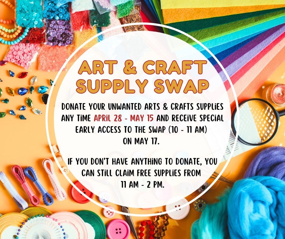 It’s time to clean out the craft closet! Whether you’re a crafter or artist looking to reduce your stash, or someone ready to explore a new hobby, come join us for our Arts & Crafts Supply Swap!