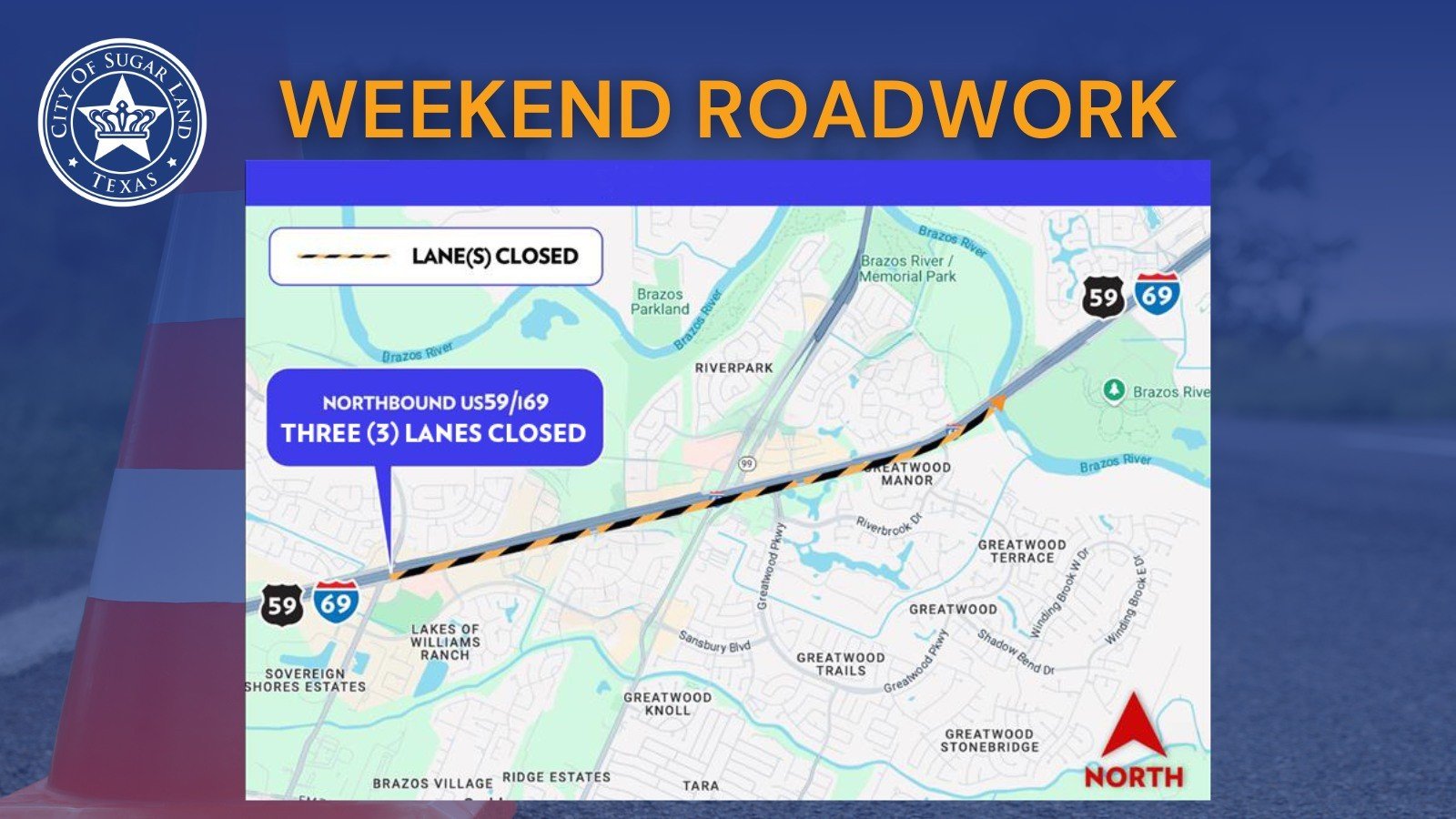 Texas Department of Transportation will close 3 inside lanes for road repairs starting Friday, May 30, at 9 pm to Saturday, May 31, at 5 am. Whether heading out of town or coming home from graduation, plan accordingly and expect delays! Drive safe, Sugar Land!
