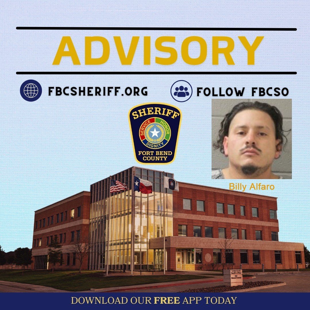 The Fort Bend County Sheriff's Office is seeking the public's help in locating person of interest, Billy Alfaro. Alfaro, 35 , is described as 5'5", 160 pounds, with black hair and brown eyes. Alfaro is considered armed and dangerous.