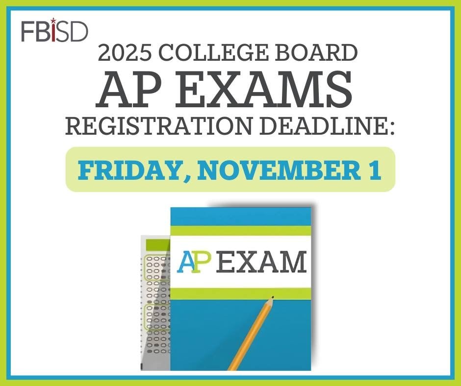 Attention, Fort Bend ISD families! A reminder that Friday, November 1 is the final day to register for the 2025 College Board AP Exams. After this date, a $40 late fee will be assessed for each exam ordered.