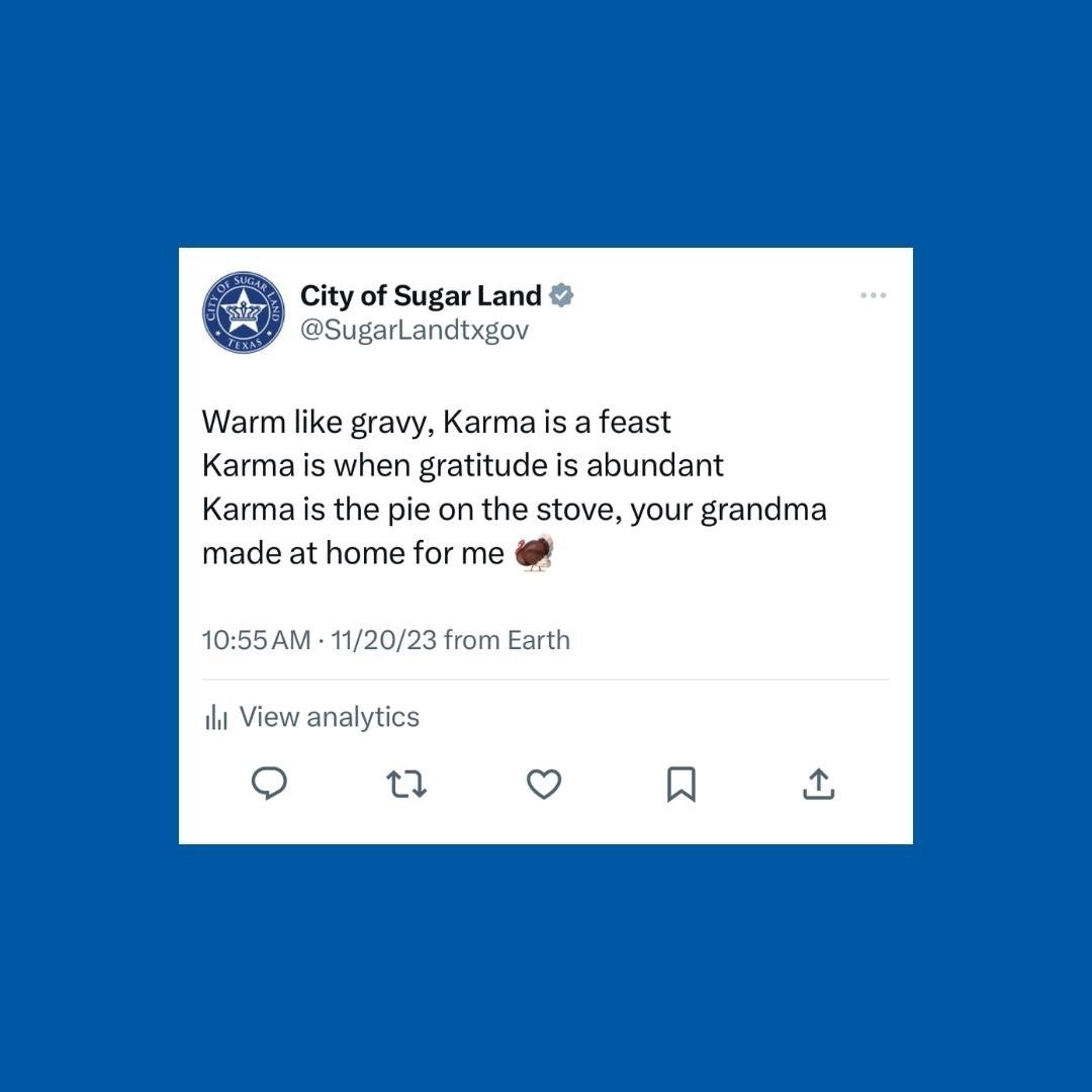 Now that the City of Sugar Land has your attention with * THEIR * lyric change.... the City is closed for the Thanksgiving holiday this Thursday (Nov. 23) and Friday (Nov. 24) and there will be solid waste impacts!