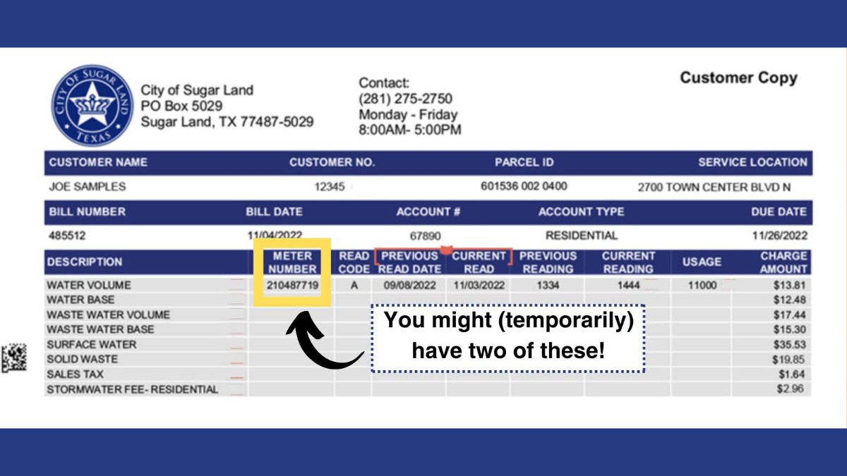 - You’ll notice two lines labeled "water volume" with different meter numbers on the first water bill you receive after replacement. Don’t worry, this is normal during a water meter changeout. One meter number reflects water consumption from your old meter, the second meter number reflects water consumption from your new meter. Once your old water meter is no longer in use, that meter number will be removed from your bill.