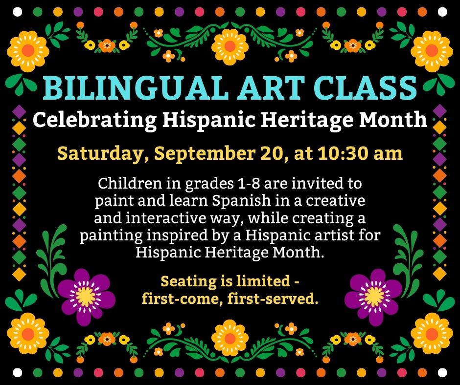 Participants will enjoy a creative, hands-on experience as they paint and learn Spanish in a fun, engaging environment. A local artist will guide the class in creating a special artwork in celebration of Hispanic Heritage Month.